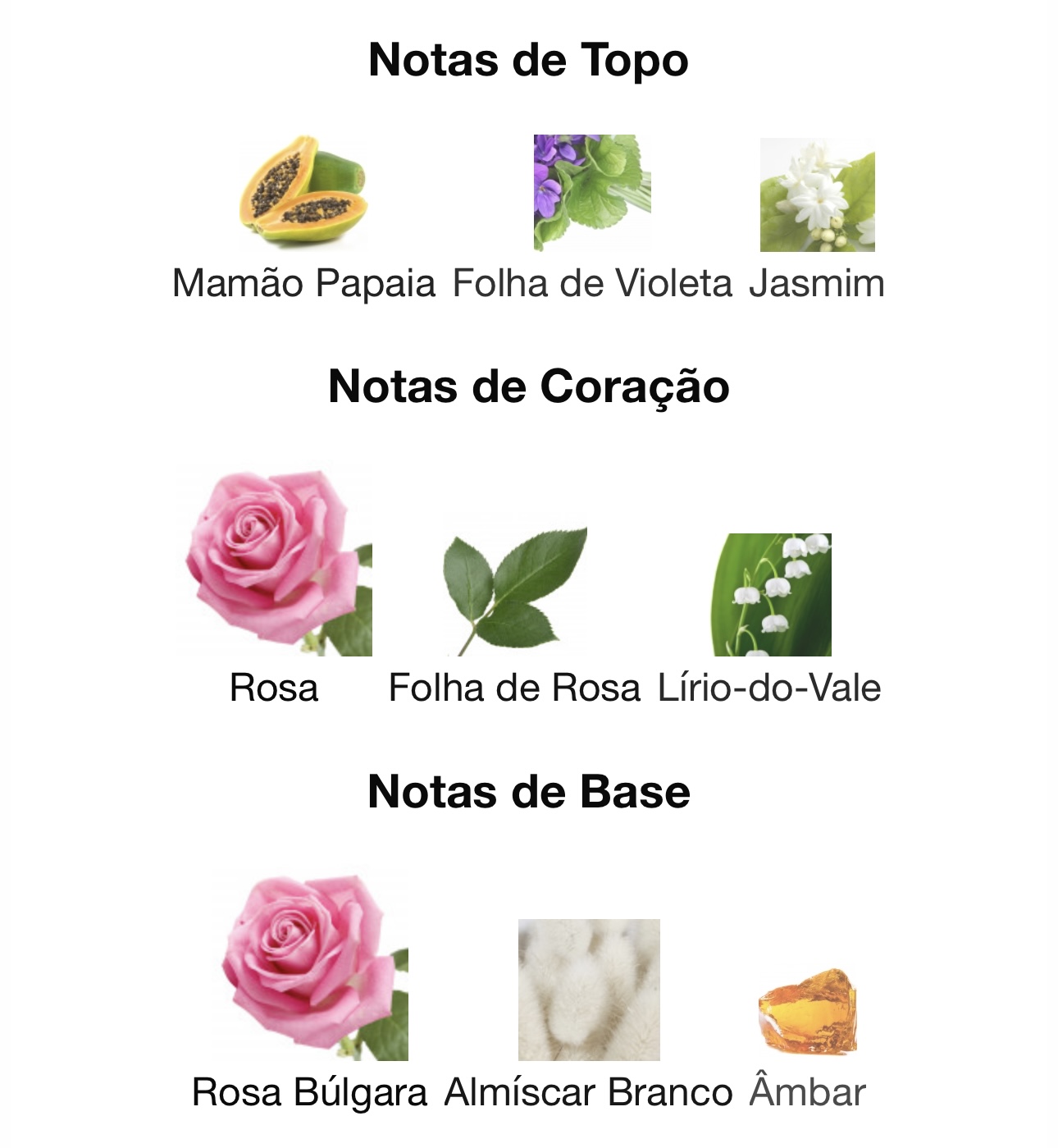 notas de coração são: Rosa Turca, Peônia, Almíscar, Petalia e Baunilha.