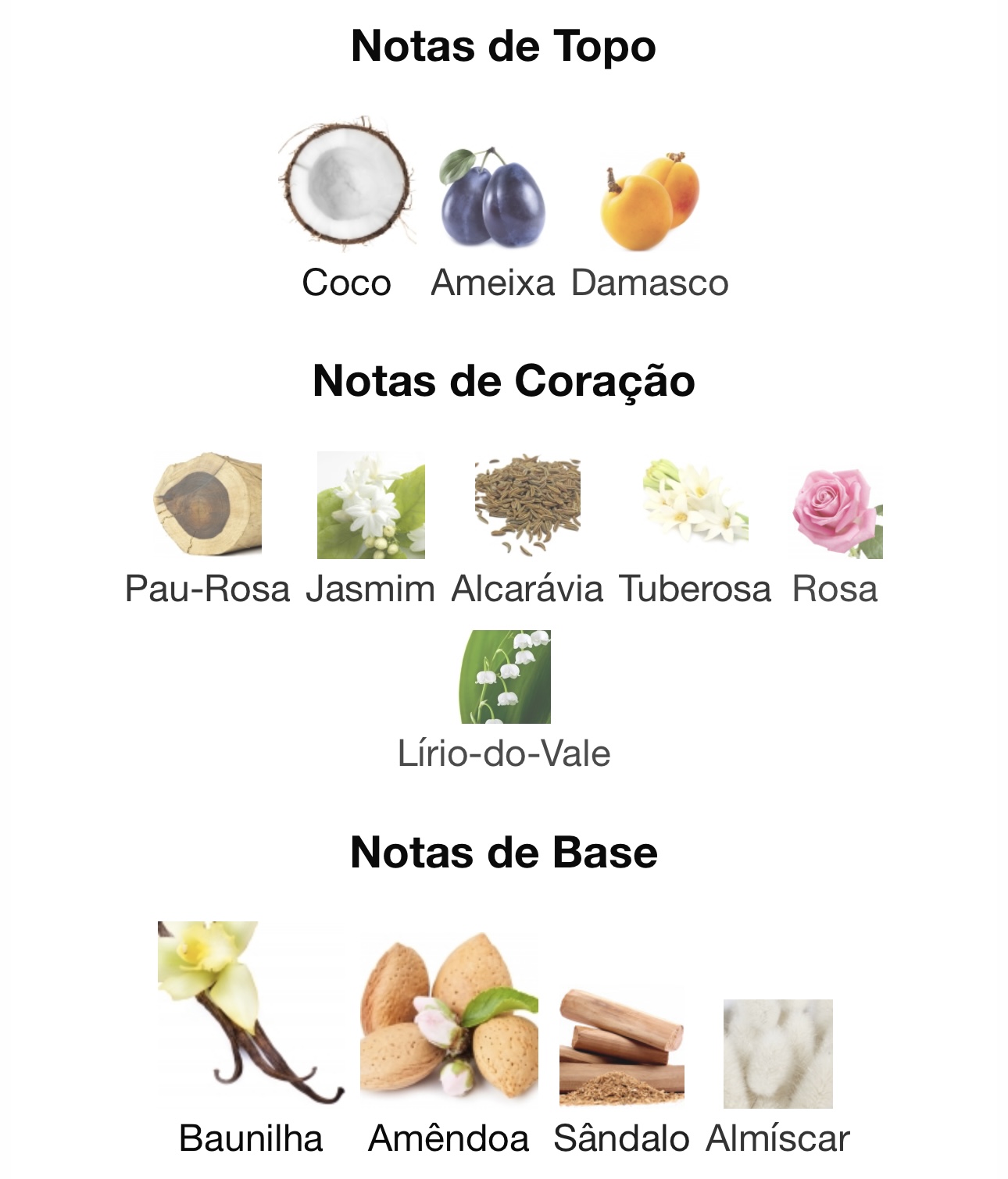 As notas de fundo são: Baunilha, Amêndoa, Sândalo e Almíscar.