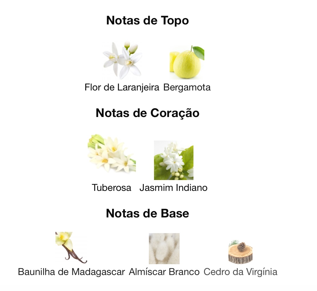 As notas de topo são: Flor de Laranjeira e Bergamota.